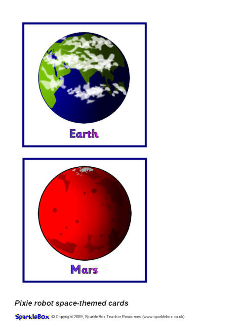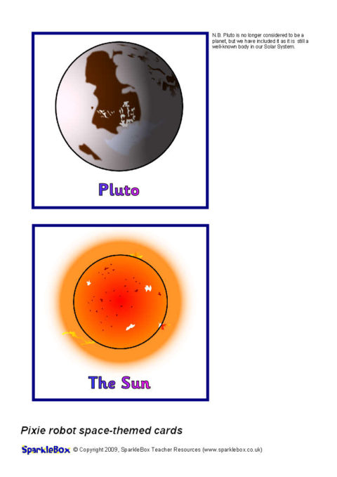 A set of printable cards featuring the planets of the solar system and other features of space.  Each card is 11cm  x 11cm in size for use with a Pixie programmable robot.