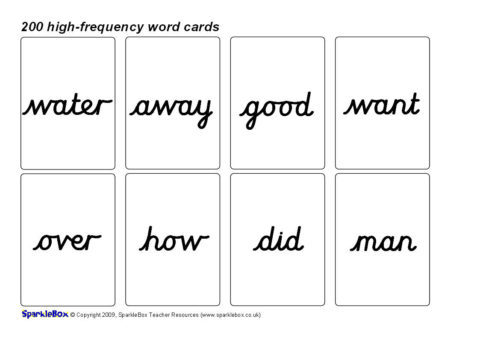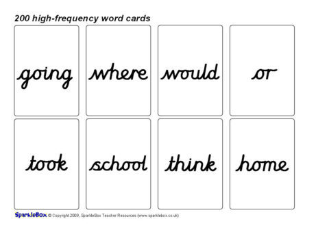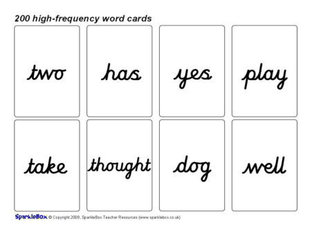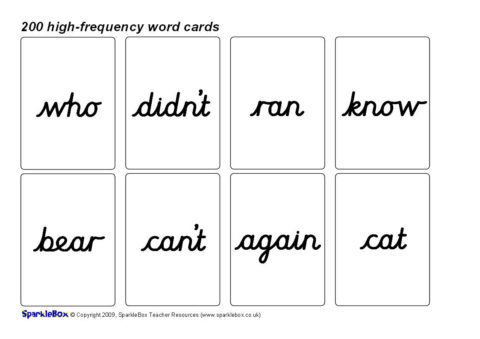 The next 200 common words as specified in the DfES ‘Letters and Sounds’ publication presented in cursive script on simple flash cards.