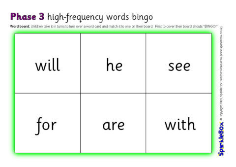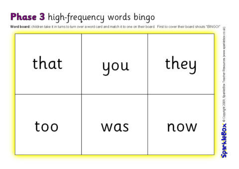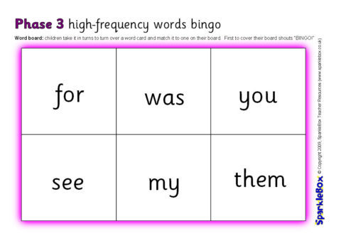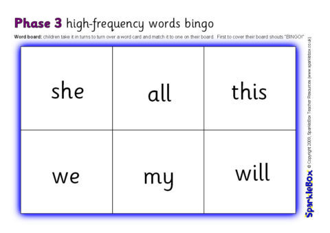 A simple bingo game featuring the Phase 3 high-frequency words, as specified in the DfES ‘Letters and Sounds’ publication.