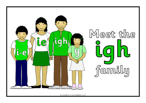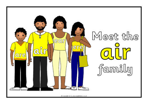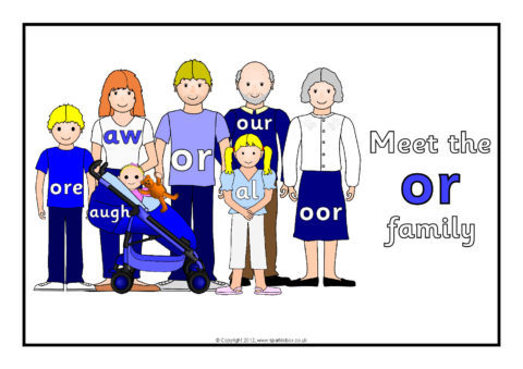 A set of A4 printable posters with ‘families’ showing various spelling patterns (graphemes) that make the same sound.