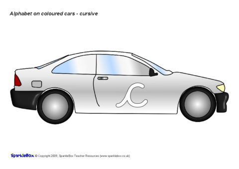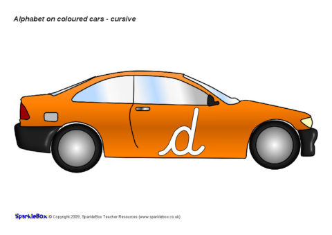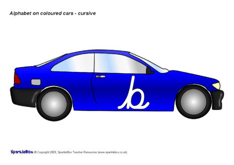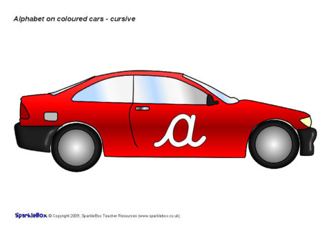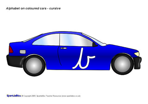 The lowercase alphabet in cursive script, presented on coloured cars.