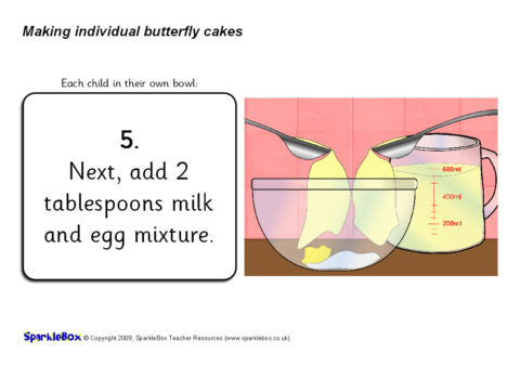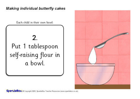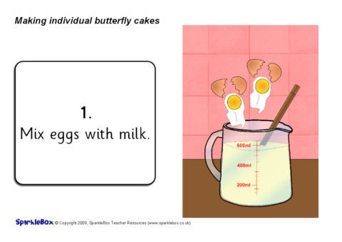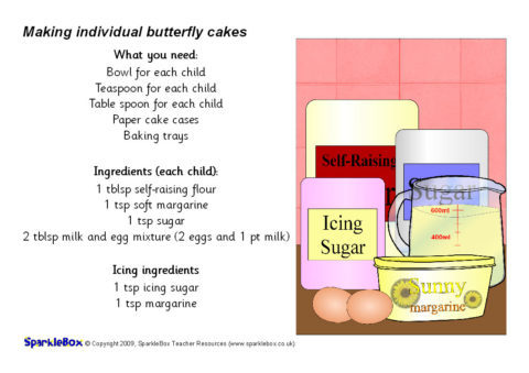 A useful set of simple visual aids with instructions on making butterfly cakes.  Each child can add and mix their own ingredients to make their own individual fairy cake(s).  It includes simple instructional text and a list of ingredients.