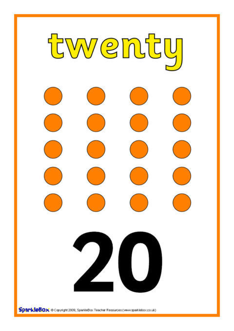 A set of simple posters showing numbers 0-20, number-words and accompanying dots.