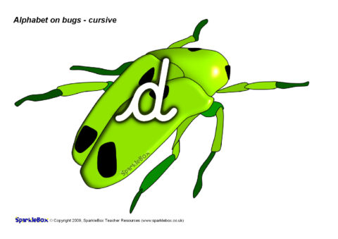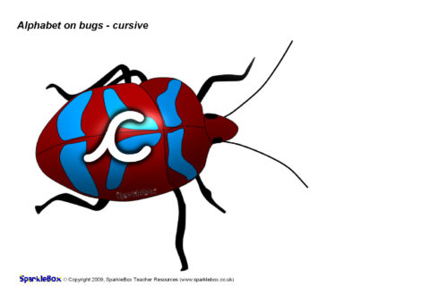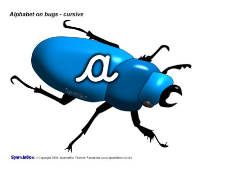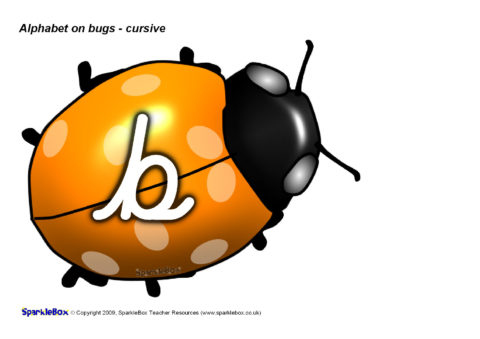 The alphabet in cursive script presented on brightly-coloured bugs.