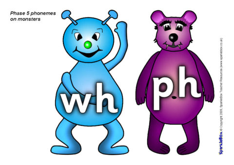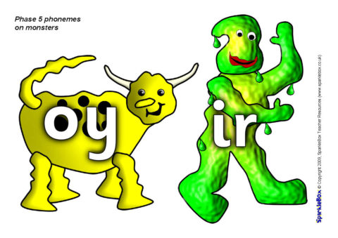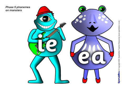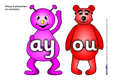 The Phase 5 phonemes specified in the DfES ‘Letters and Sounds’ publication, presented on brightly-coloured monster characters.