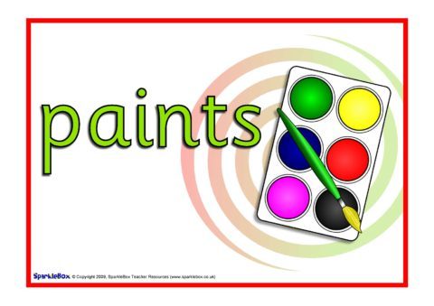 A useful and colourful group of signs for use in your creative or painting area. Labels include the words ‘paint’, ‘splat’, ‘squirt’, ‘picture’, ‘sketch’, ‘drip’ and ‘felt tips’.