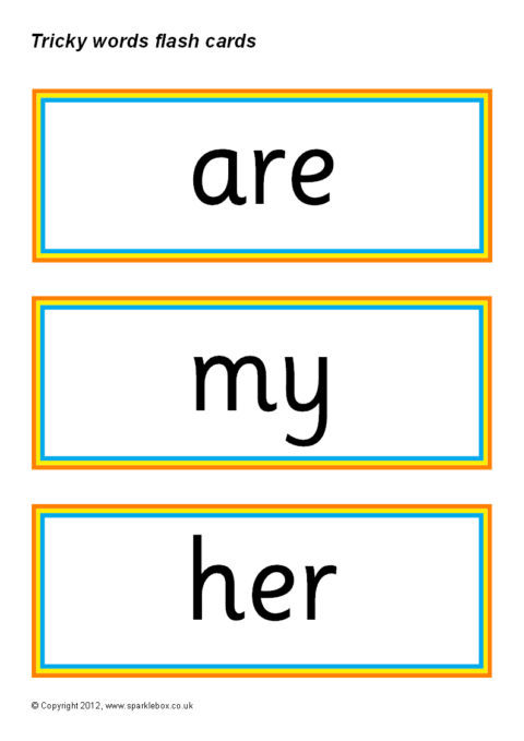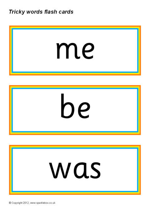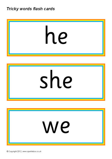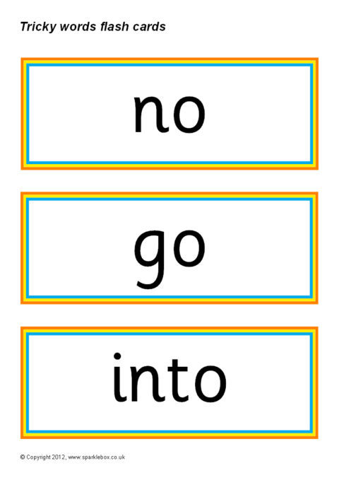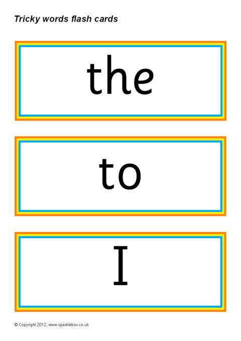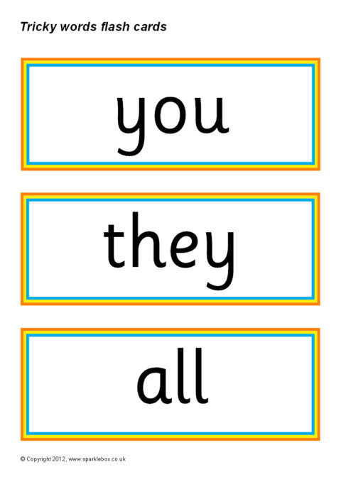 The tricky words (as specified in the DfES ‘Letters and Sounds’ publication) presented on cards with brightly-coloured borders.