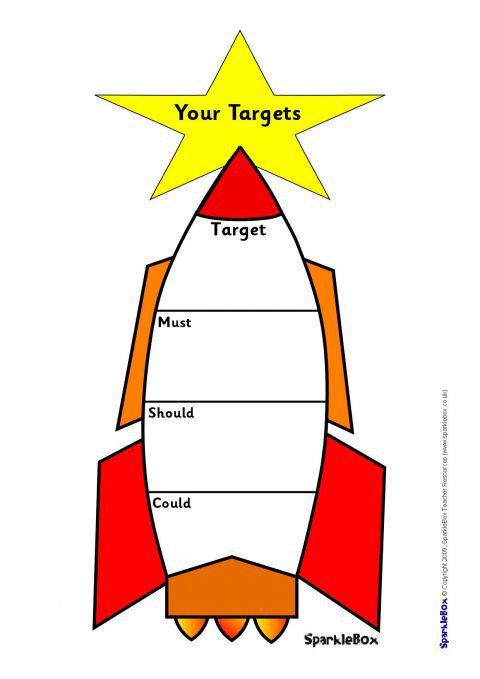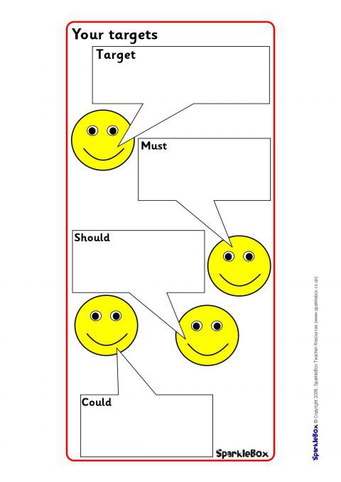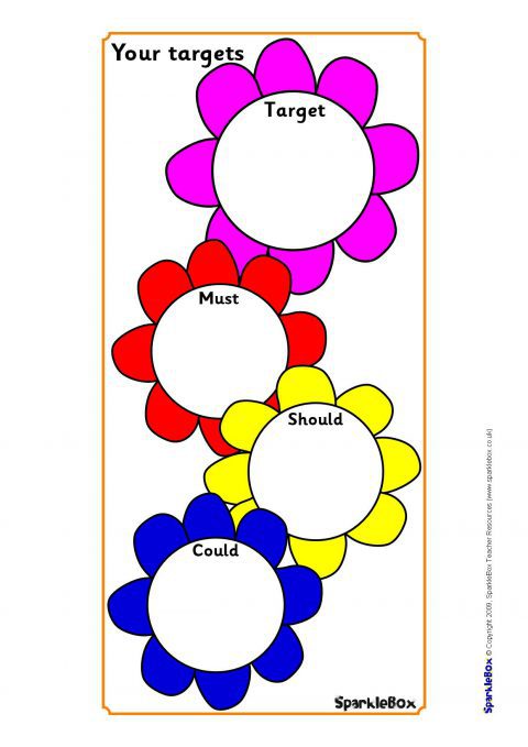 Editable colour target sheets with rocket, flowers or smiley themes. Add your target as well as must, should and could objectives.