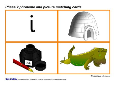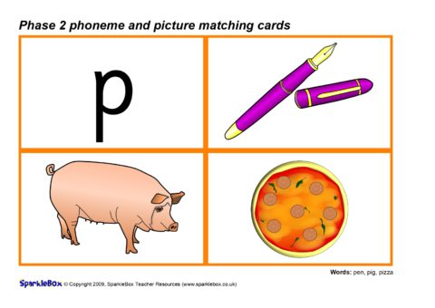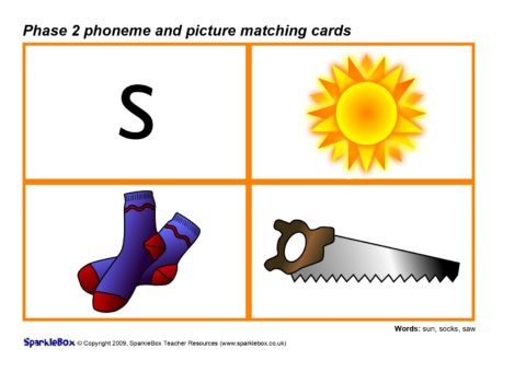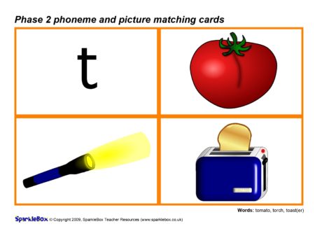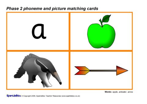 A set of printable cards with the Phase 2 phonemes (specified in the DfES ‘Letters and Sounds’ document) together with pictures for matching activities.