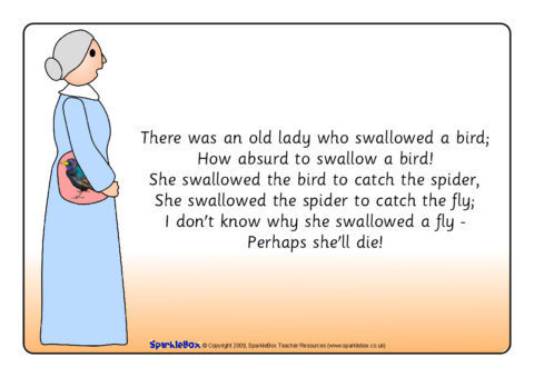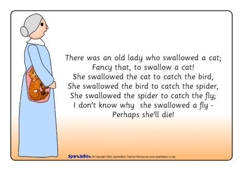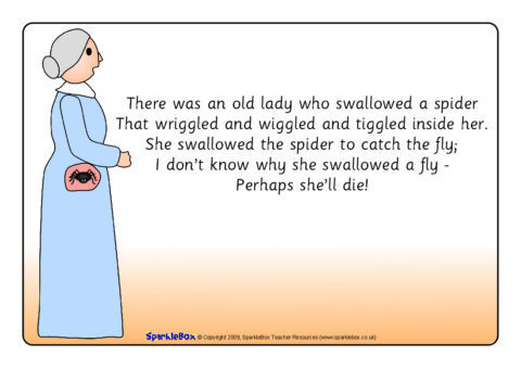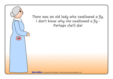 A set of A4 visual aids to accompany the well-known rhyme ‘There was an old woman who swallowed a fly.’