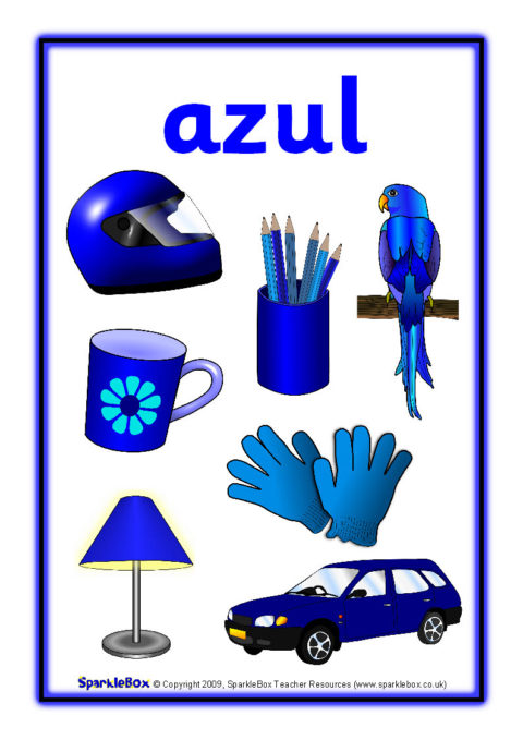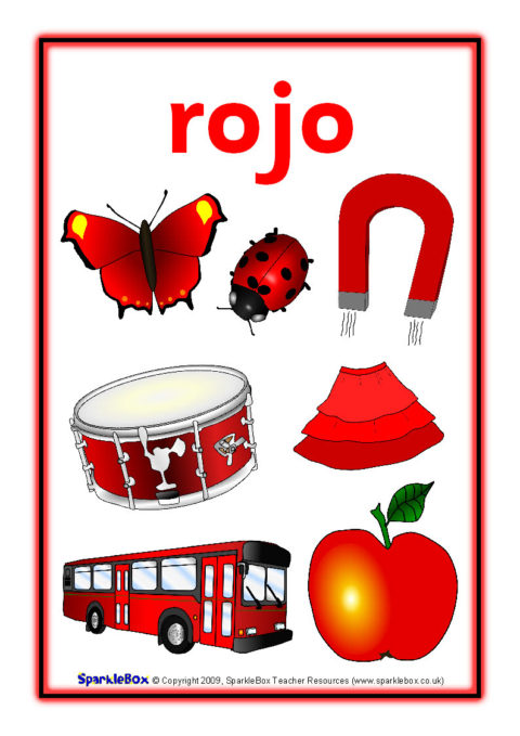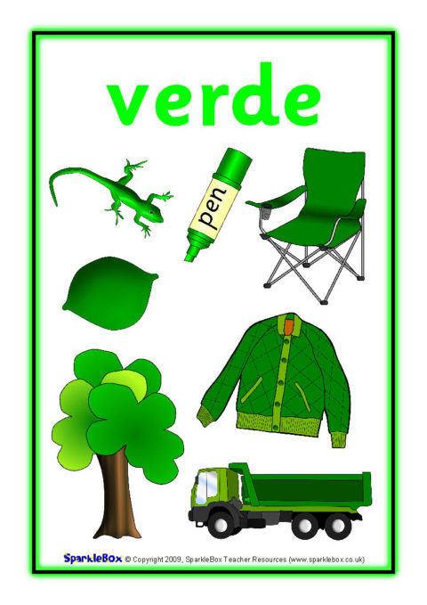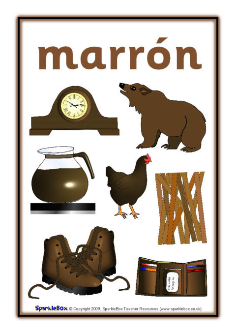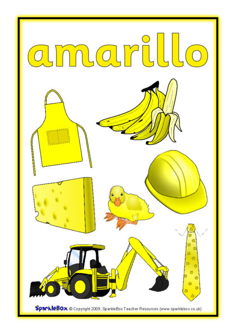 A set of 11 A4 posters featuring the colour names in Spanish and objects in each colour.