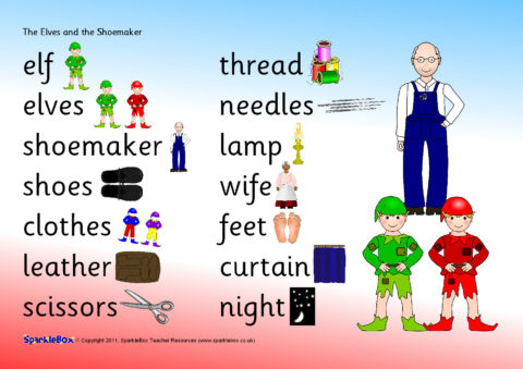 A printable desktop mat featuring words and pictures from the popular traditional tale of ‘The Elves and the Shoemaker’.