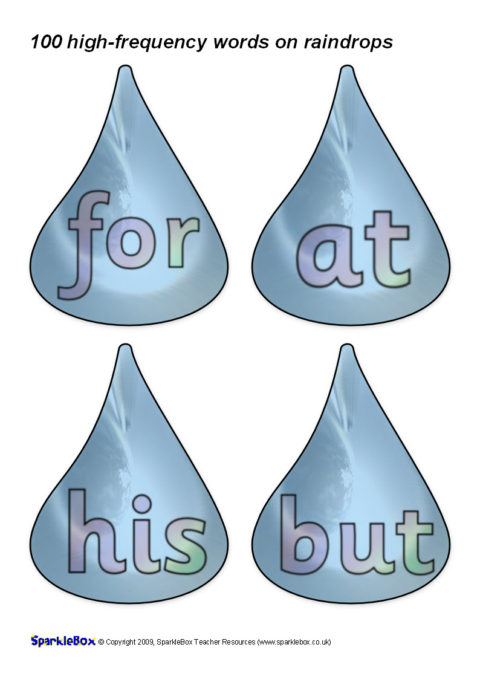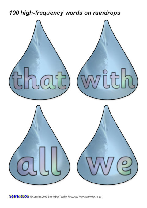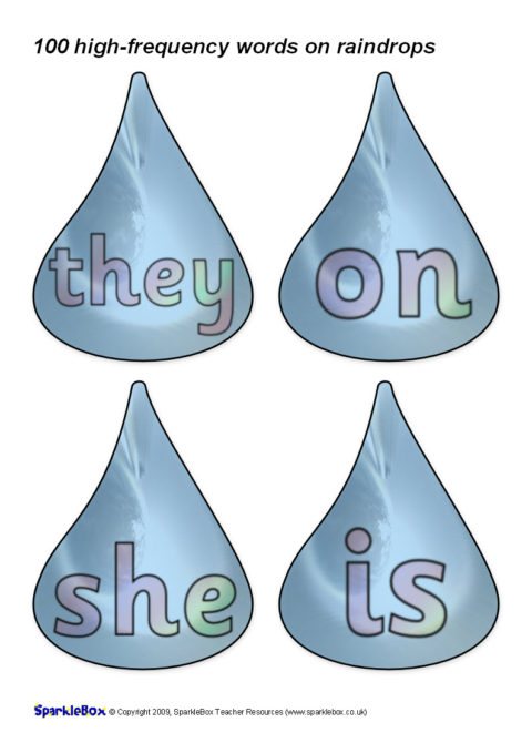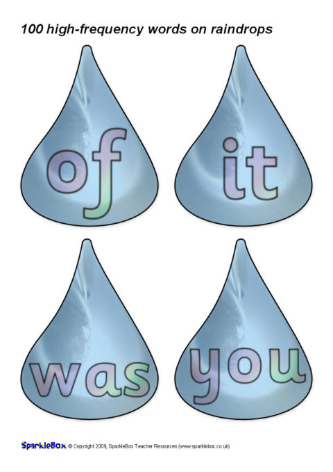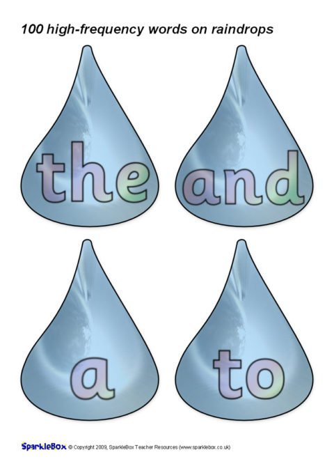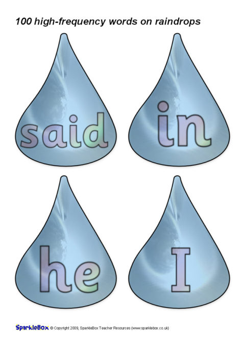 A set of printable raindrops showing the 100 high-frequency words as specified in the DfES ‘Letters and Sounds’ publication.