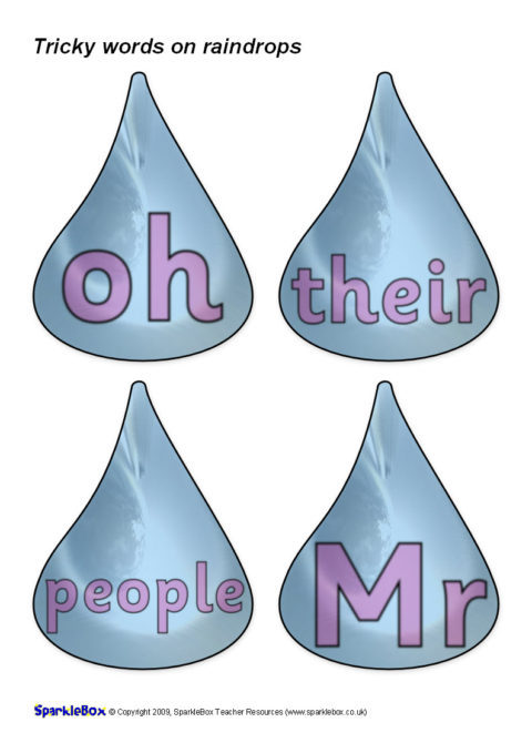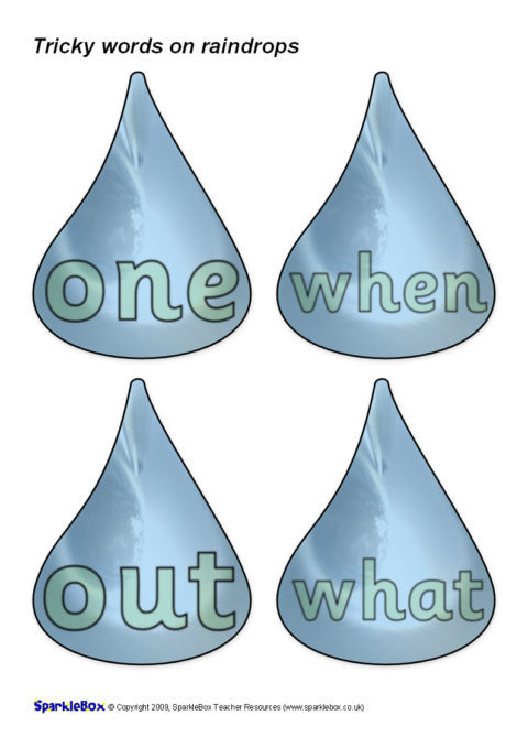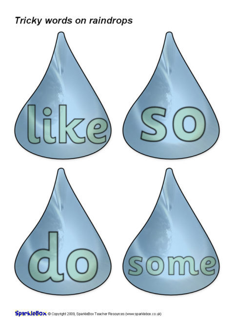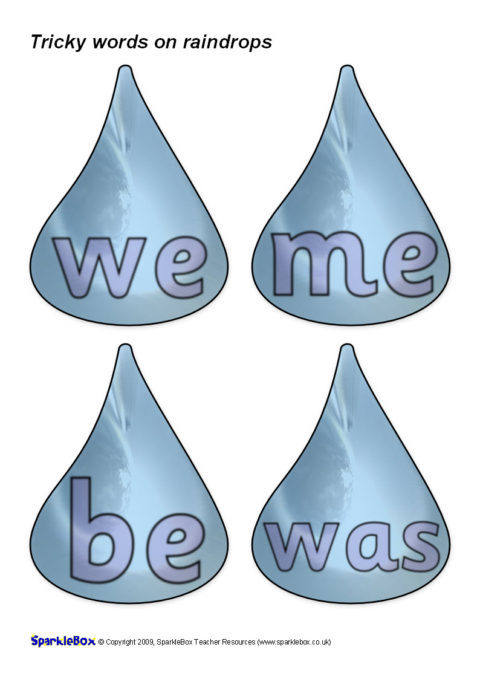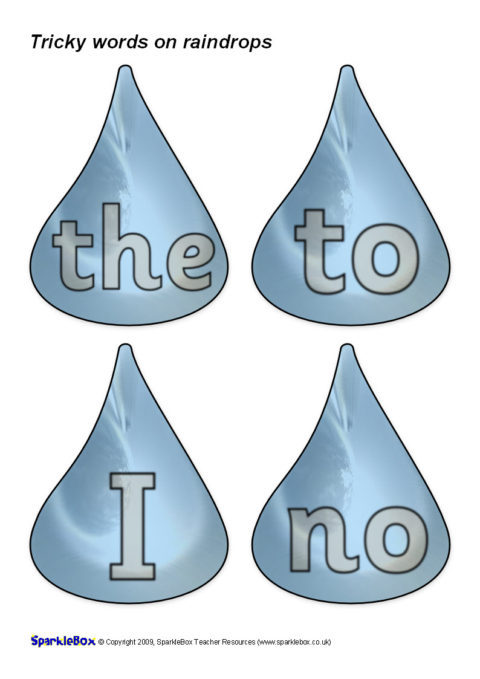 A set of printable raindrops featuring the tricky words as specified in the DfES ‘Letters and Sounds’ publication.