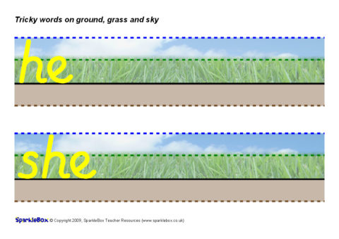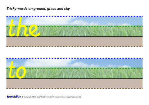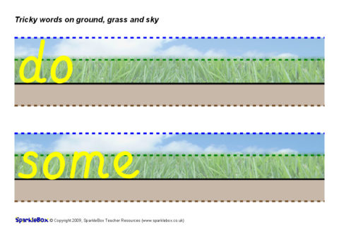 The tricky words as specified in the DfES ‘Letters and Sounds’ publication presented on ground, grass and sky writing lines.