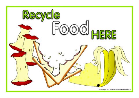 A set of printable posters/labels to show children where to discard paper, plastic and food for recycling.
