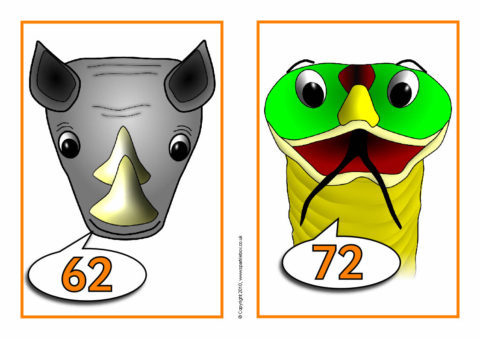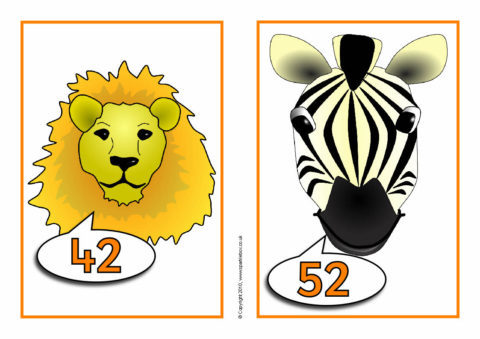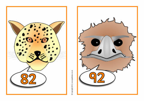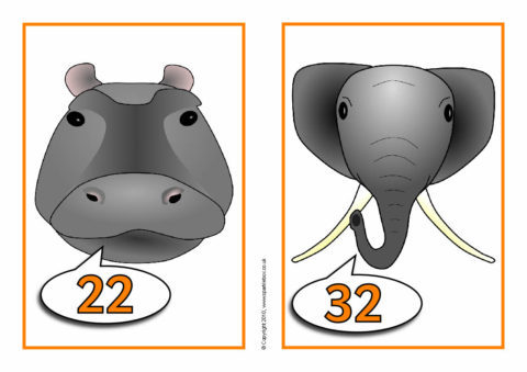 A5 flash cards featuring safari animals saying numbers in 10s from 2 to 102.