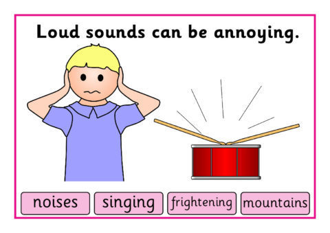 A set of A4 colourful posters showing sentences with pictures and substitute words to make new sentences.