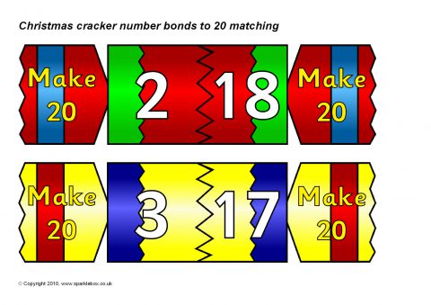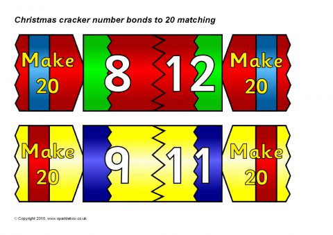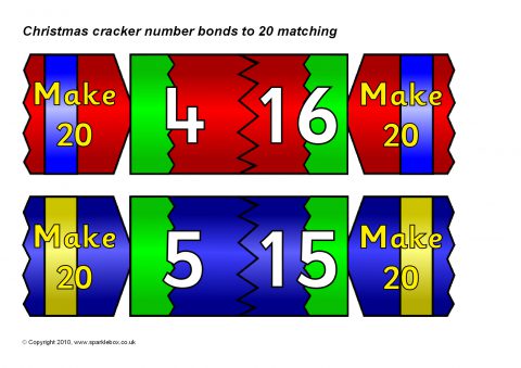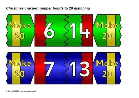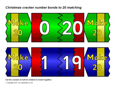 Print and cut out for a simple activity where children match the two halves of each Christmas cracker to make number bonds to make 20.