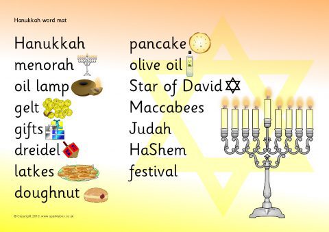 A printable word mat featuring words and pictures linked to Hanukkah. Ideal for children to use as prompts when writing.