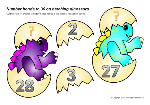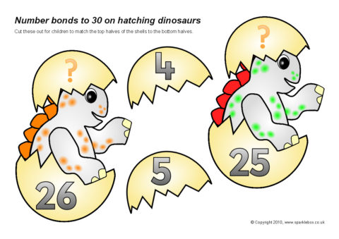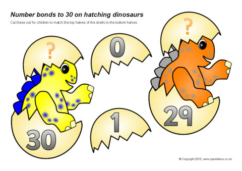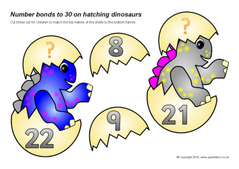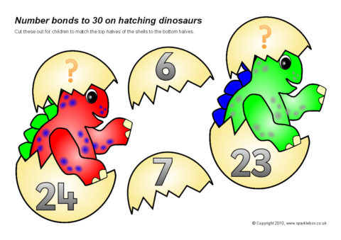 Print and cut out for a simple activity where children match the two halves of each dinosaur shell to make number bonds to make 30.