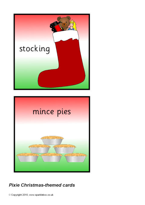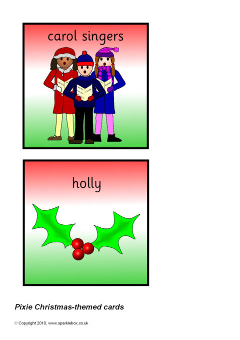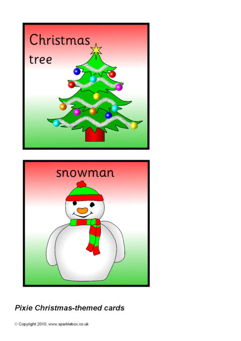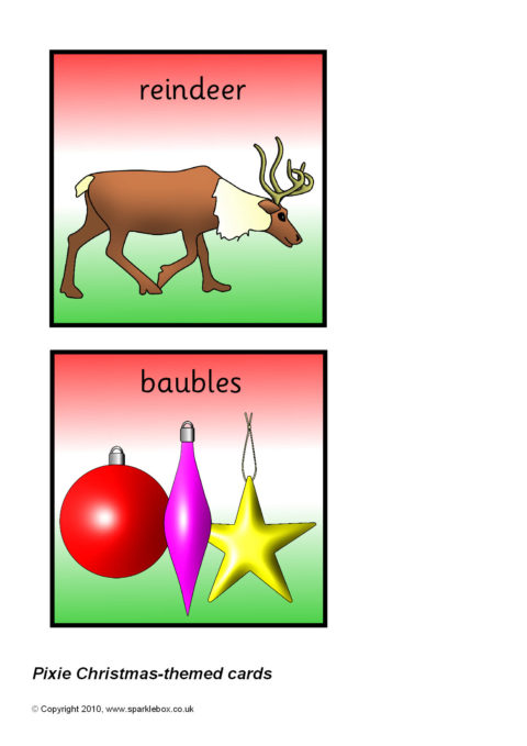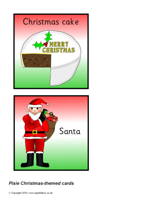 Multi-use printable cards with pictures and words associated with Christmas. Each card is 11cm by 11cm - ideal for use with a Pixie programmable robot.