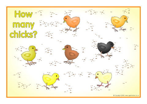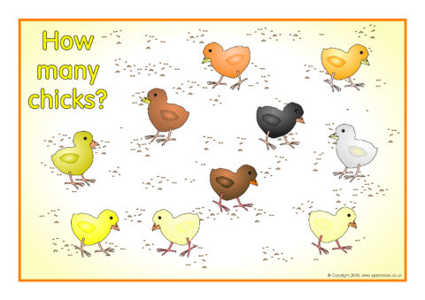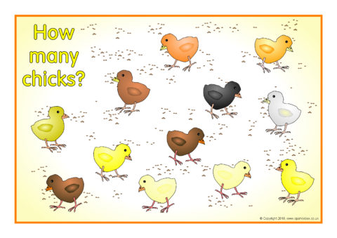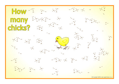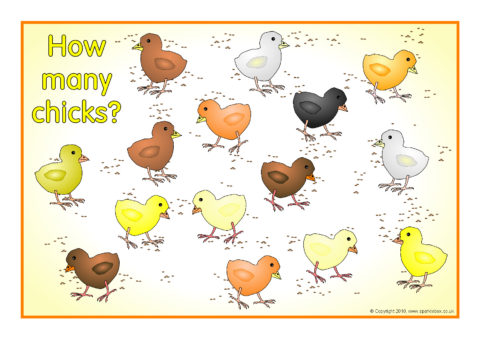 A set of 20 A4-sized posters showing chicks eating grain from 1-20. Great as visual aids for counting and estimation.