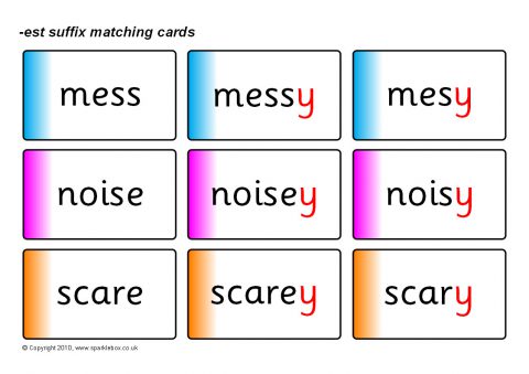 Printable cards where children match the root card to the correct spelling when the suffix -y is added.
