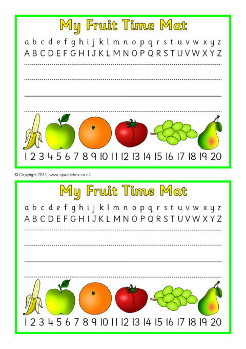 Printable placemats for snack/fruit time featuring the alphabet in lower and upper case, numbers from 1 to 20 and space for the child’s name.