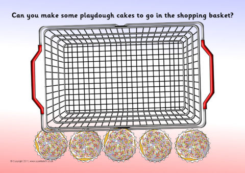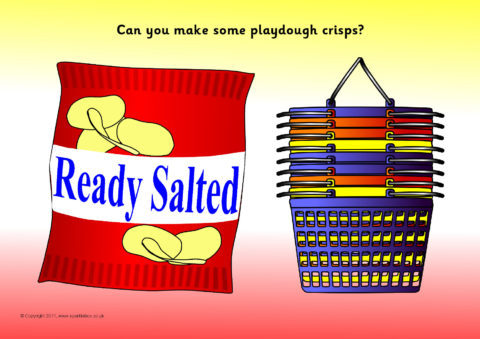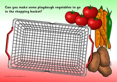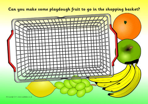 A set of playdough mats with a supermarket food theme. Children make fruit and vegetables for the basket, crisps, eggs for the egg box and numbers on the till display.