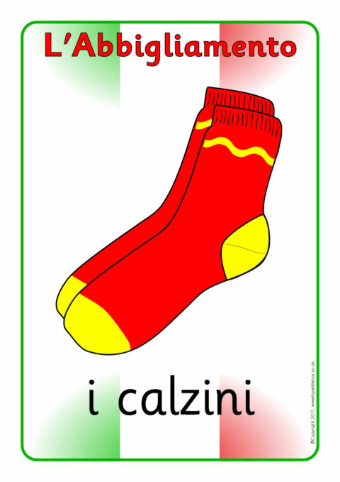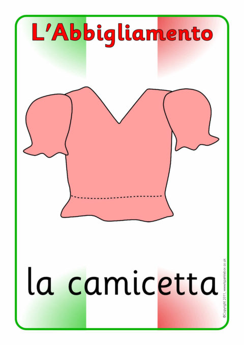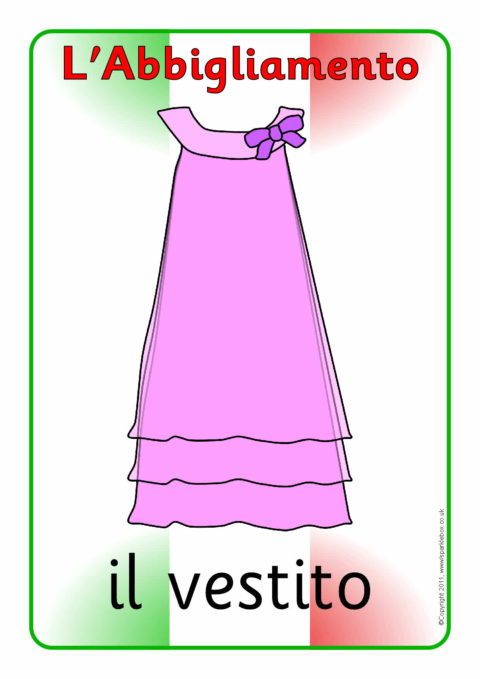 A set of A4 posters featuring pictures of various clothes and their names in Italian.