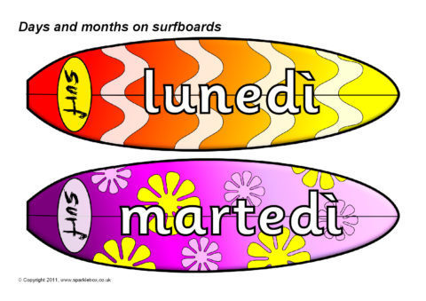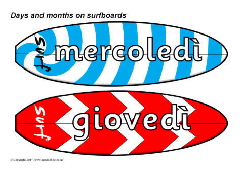 The days of the week and months of the year in Italian, presented on colourful surfboards.