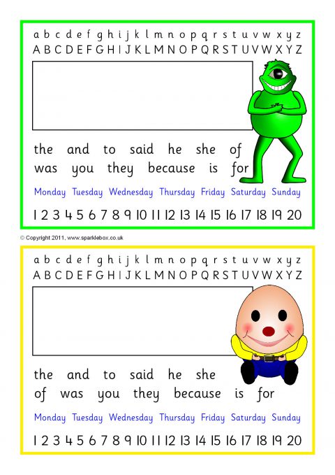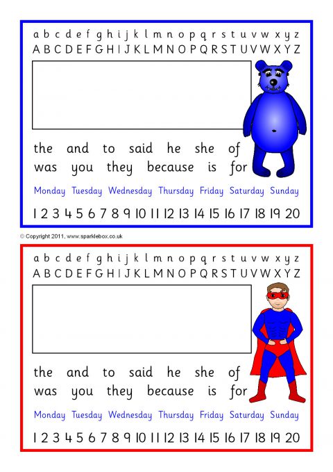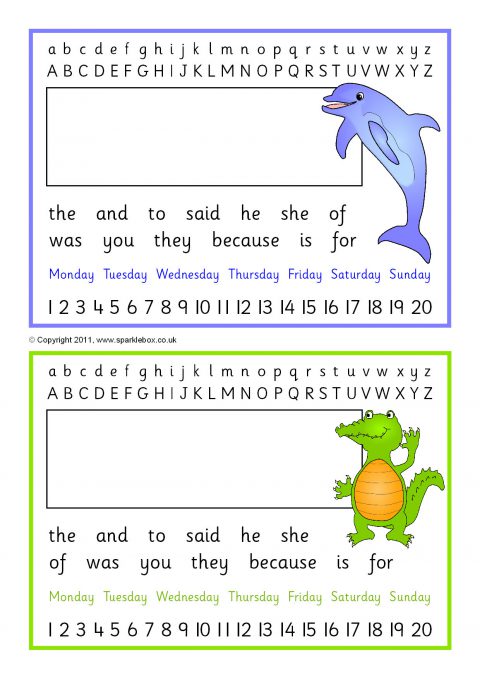 Printable placemats featuring the alphabet in lower and upper case, numbers from 1 to 20 and space for the child’s name.