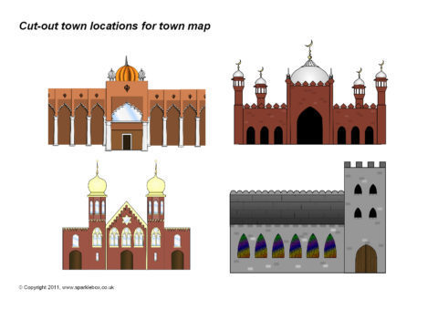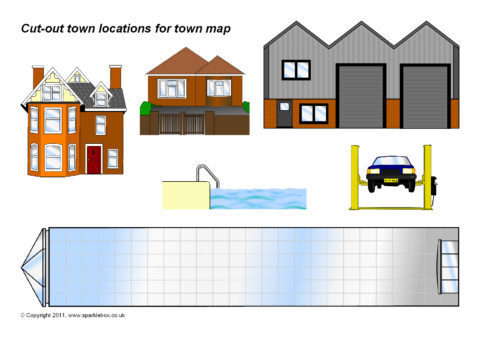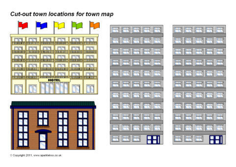 A set of cut-out pictures of buildings and places found around a town/city. Great for children to create their own town maps or for story boards/maps.