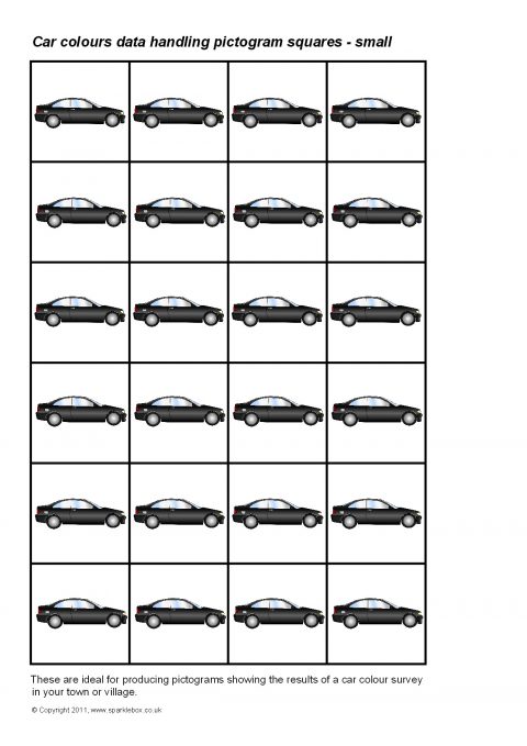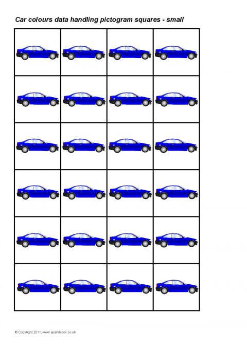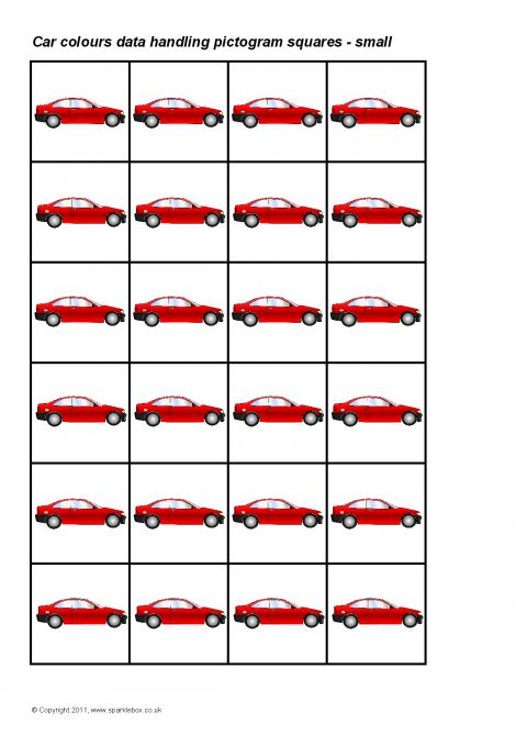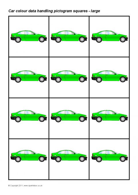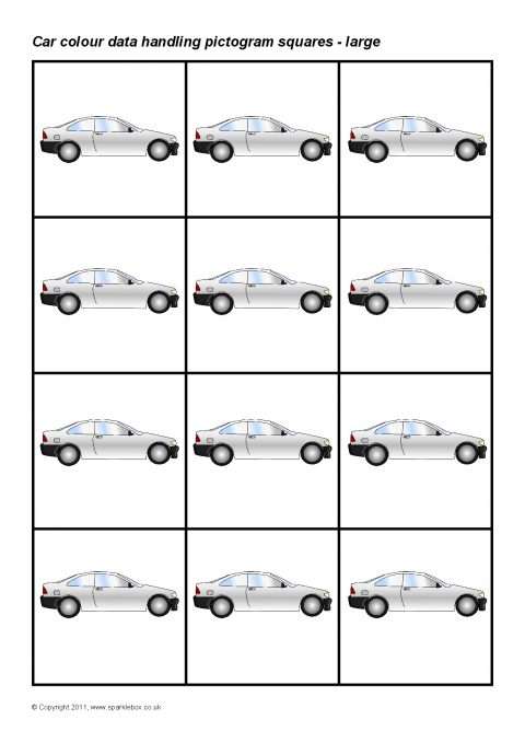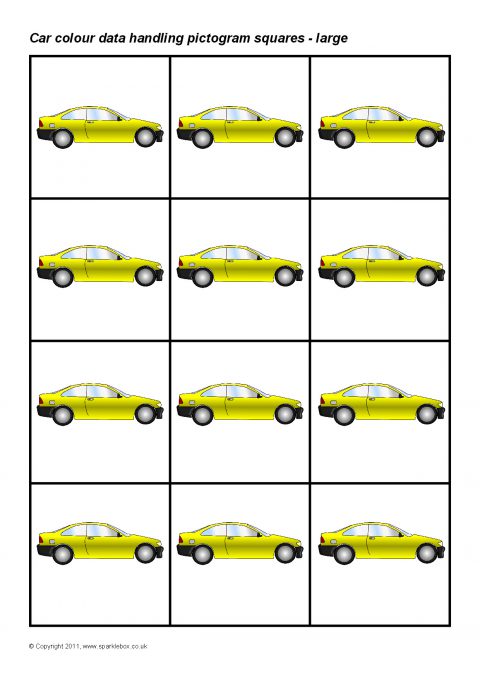 Printable squares featuring different coloured cars.  Ideal for use when creating a pictogram to showing the results of a car colour traffic survey.