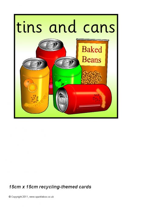 A set of printable cards, 15cm x 15cm size, featuring images of various items of rubbish along with pictures of different rubbish and recycling bins.