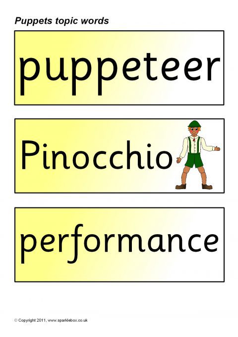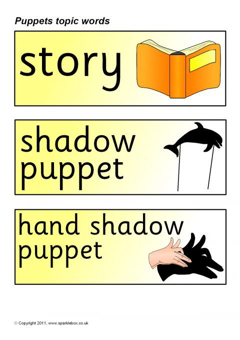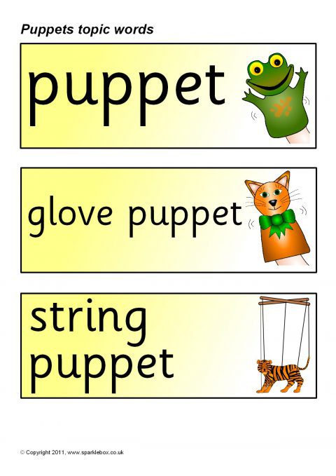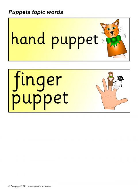 A set of printable word and picture cards linked to puppets.