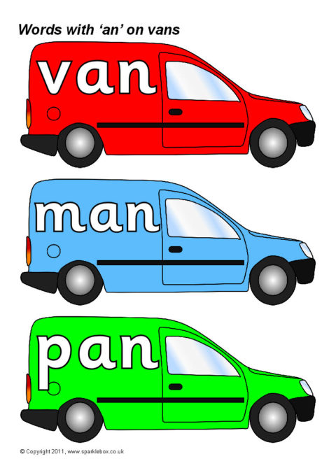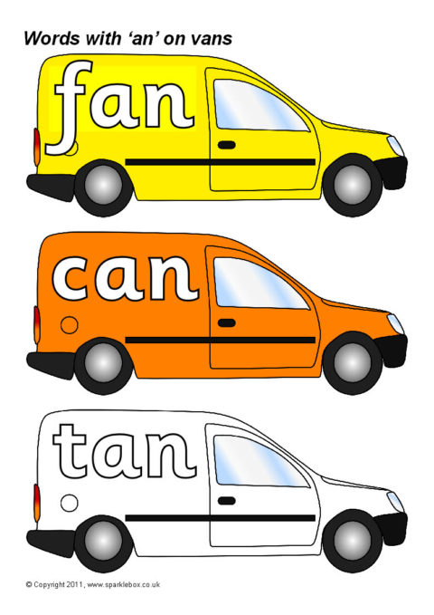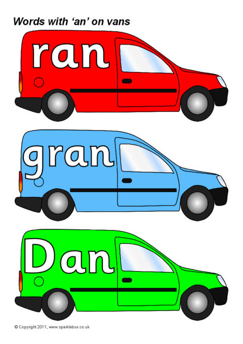 Words with the rime ‘an’ presented on coloured vans.