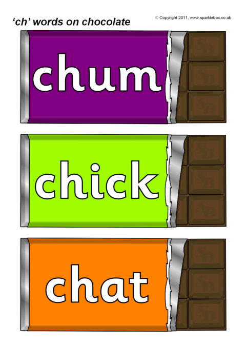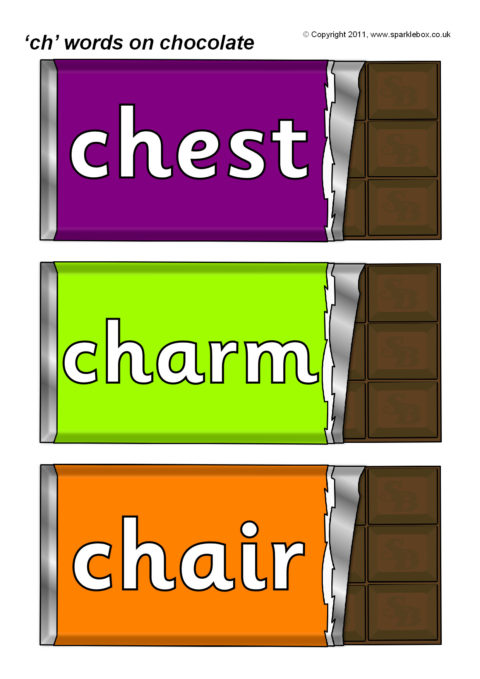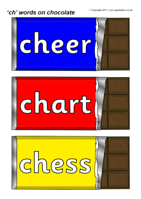 Words with the onset ‘ch’ presented on coloured chocolate bars.