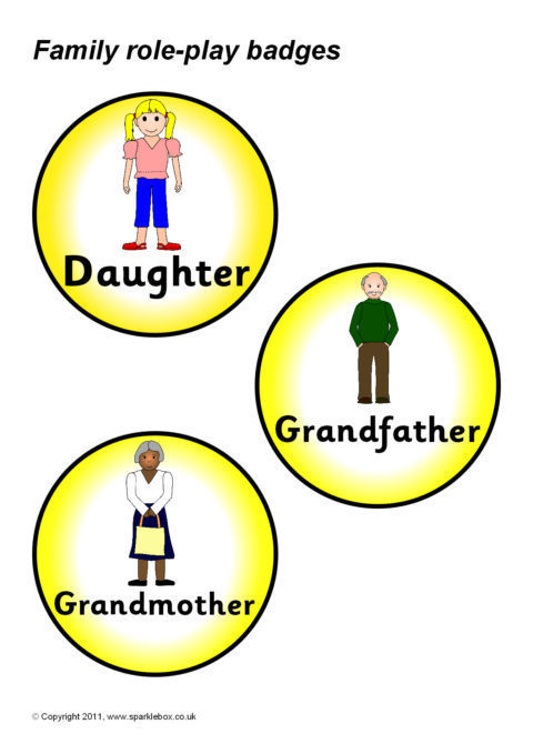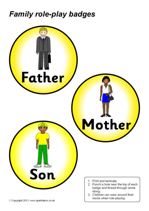 Simple printable badges for assigning different family roles in role-play situations. Print, laminate and thread with string to go around children’s necks.