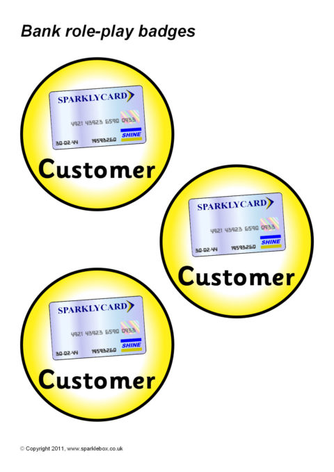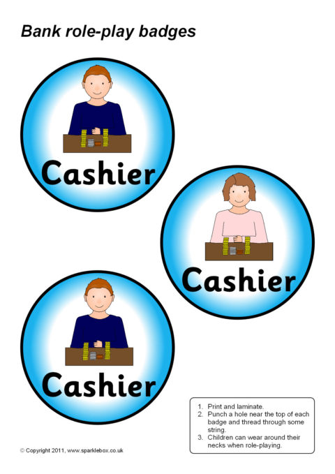 Simple printable badges for assigning different roles in a Bank role-play situation. Print, laminate and thread with string to go around children’s necks.