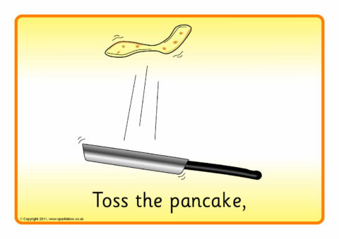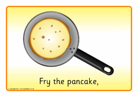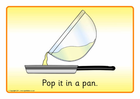 A set of simple A4-size visual aids for use with the rhyme, ‘Mix a pancake...’.