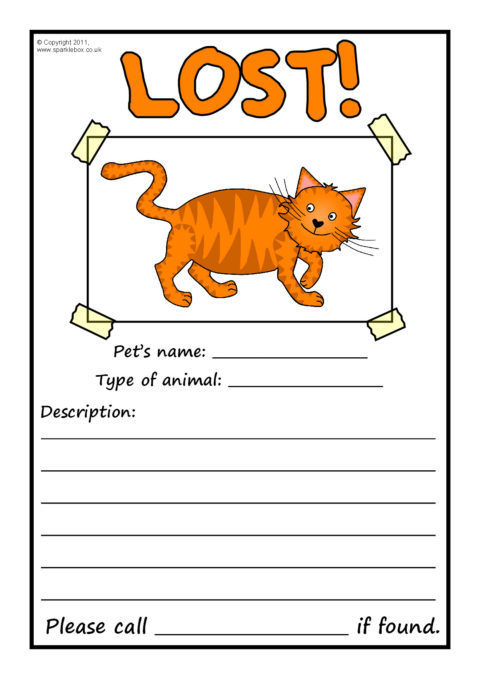 Printable writing frames for lost pet posters. With space to write the pet’s name, type of animal, description and phone number.