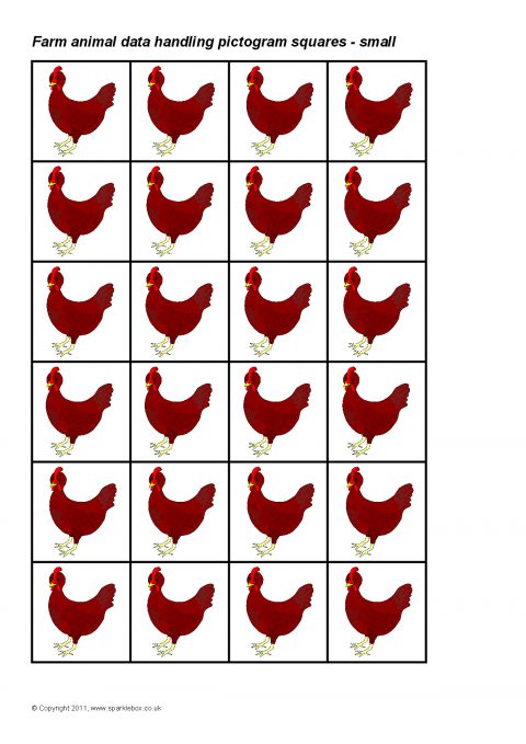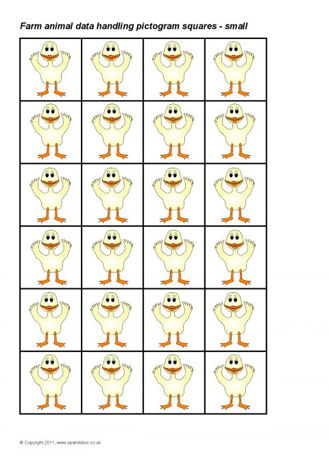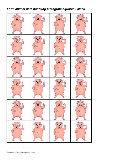 Printable squares featuring different farm animals. Ideal for use when creating a pictogram to showing the results of a ‘favourite farm animal’ class survey.