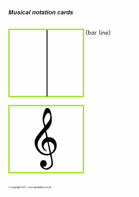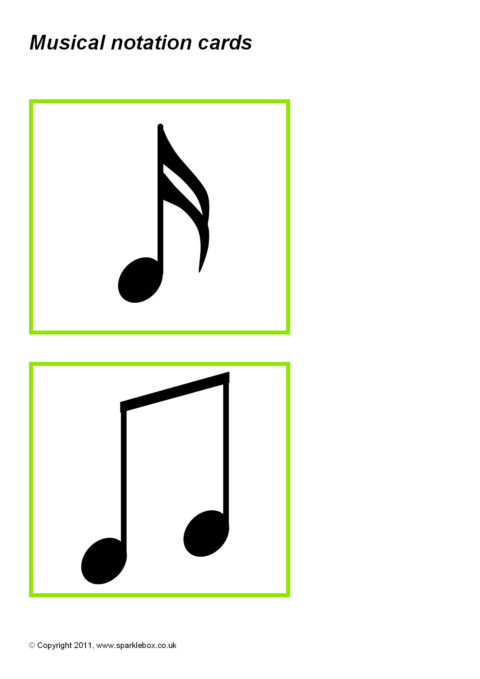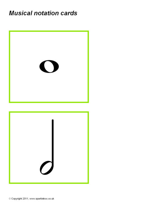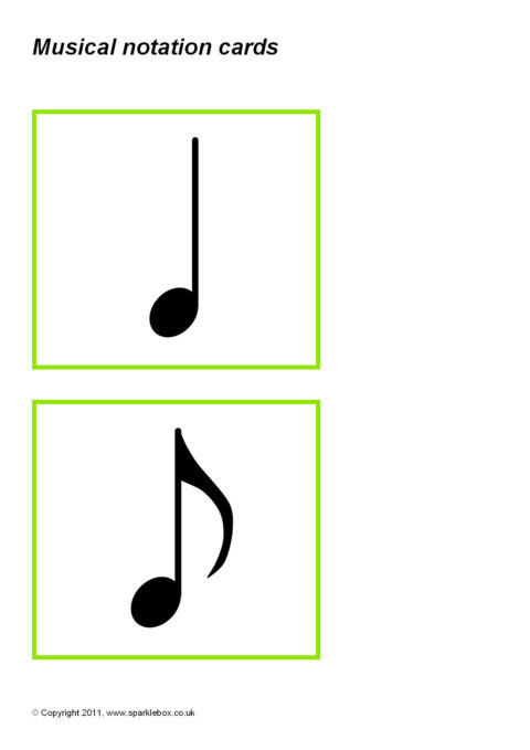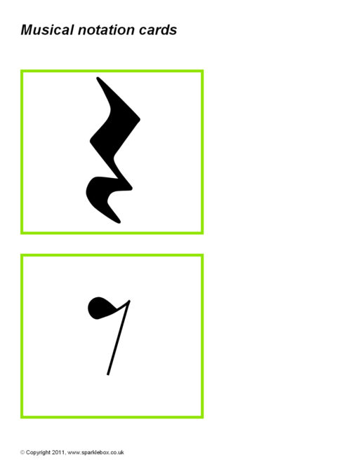 A set of printable cards with the musical notation for different length notes and rests. Could be laid out in sequences for children to create their own rhythmical phrases.