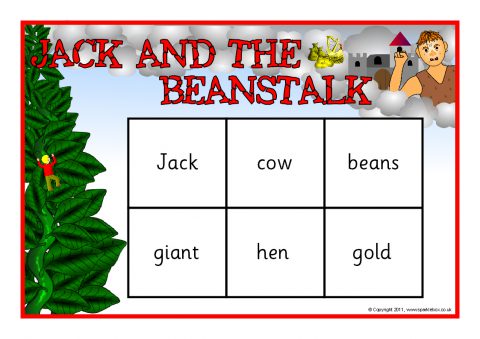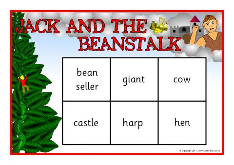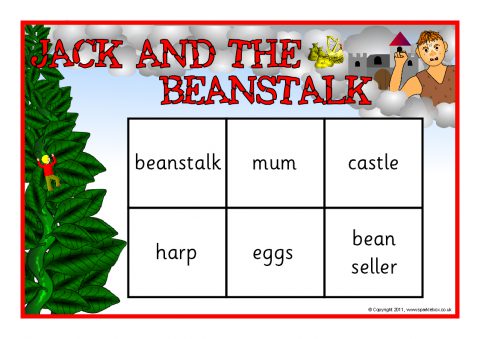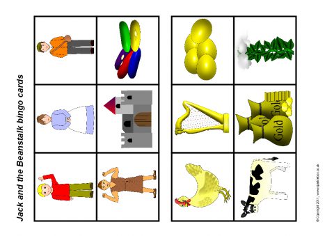 Printable bingo word boards and picture cards linked to the story of Jack and the Beanstalk.