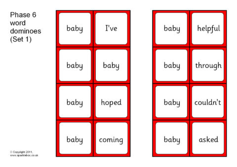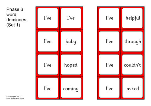 Printable word dominoes featuring words appropriate for Phase 6 level. A great activity to practise reading and recognition of these words with irregular spellings.