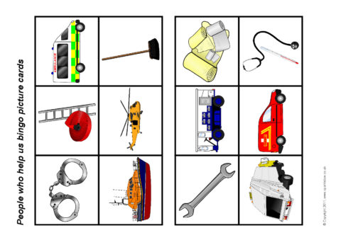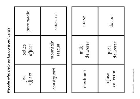 A set of printable bingo picture boards where children can match picture or word cards to the people who help us.