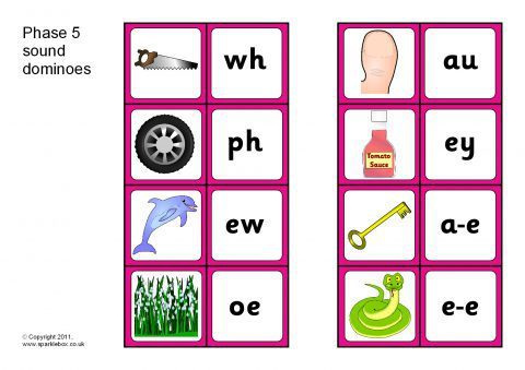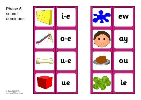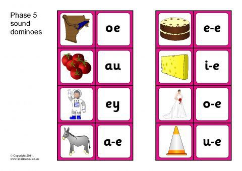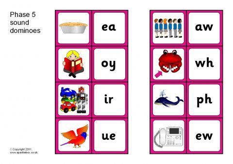 Printable word dominoes featuring Phase 5 phonemes and pictures. A great activity to practise recognition of the sounds.
