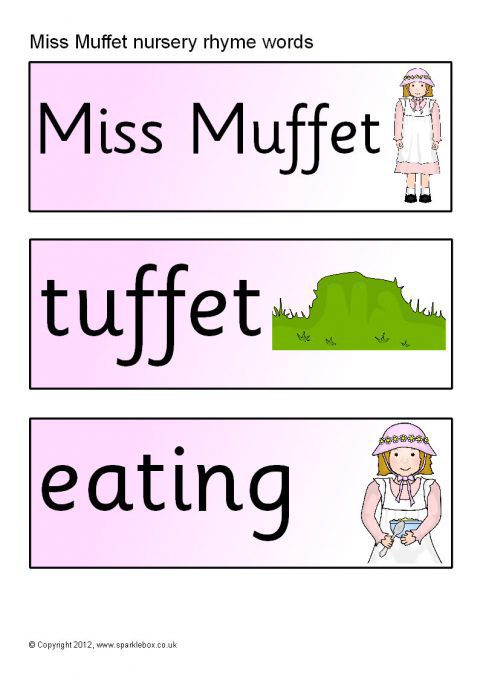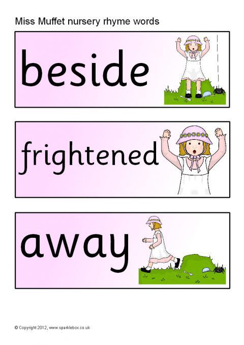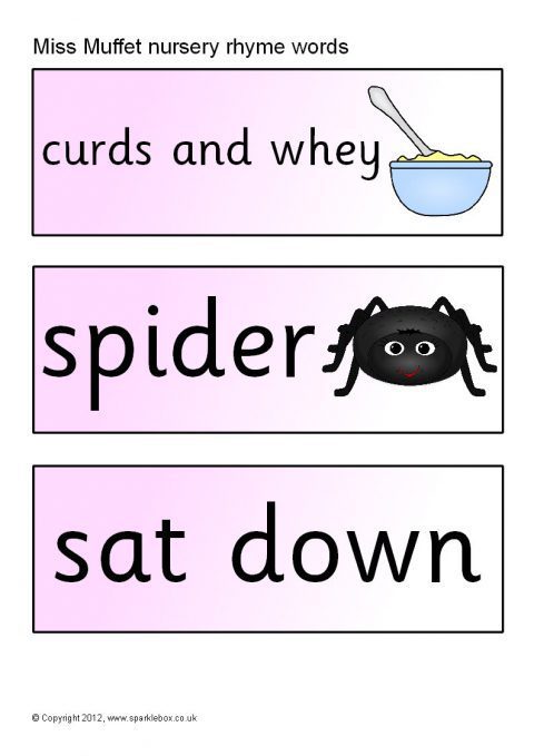 Printable word and picture cards linked to the Miss Muffet nursery rhyme.
